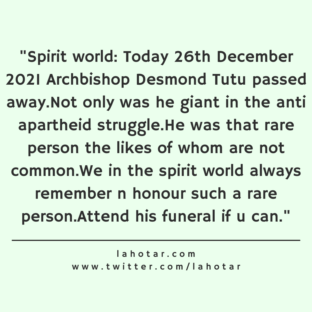 Spirit world: Today 26th December 2021 Archbishop Desmond Tutu… Posted on December 26, 2021 0 m read Share this article 0